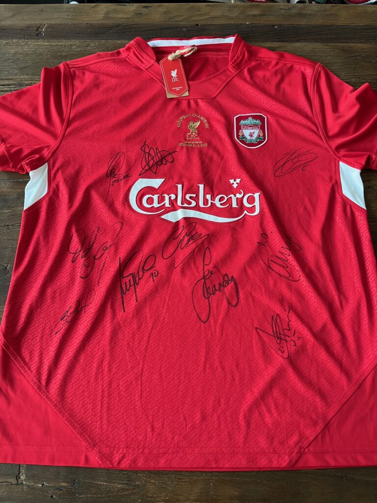 Genstand 1: Signeret trøje af Smicer, Hyypia, Riise, Hamann, Cisse, Dudek, Carragher, Garcia, Gerrard og Traore. Str. XL
